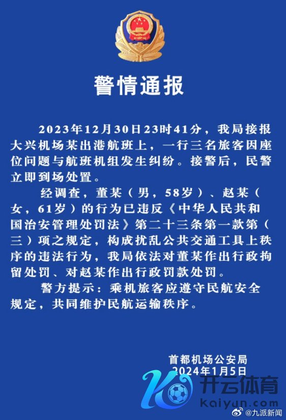 1月5日,据齐门机场公安通报:2023年12月30日23时41分,我局接报大兴机场某出港航班上,一瞥三名搭客因座位问题与航班机组发生纠纷。接警后,民警立即到场处理。 经看望,董某(男,58岁)、赵某(女,61岁)的行径已违犯《中华东说念主民共和国次第管制处罚法》第二十三条第一款第(三)项之法规,组成侵略巨匠交通器具上规律的罪犯行径,我局照章对董某作出行政拘留处罚、对赵某作出行政罚金处罚。警方教导:......【更多...】