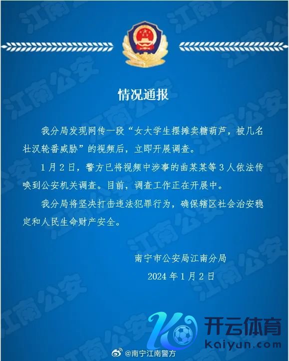1月1日体育游戏app平台,广西南宁一大三女学生称我方创业卖糖葫芦,被几个同业依次威逼不让其摆摊。当地警方最新通报称,已将涉事3东谈主照章传唤到公安机关探询。 据@南宁江南警方 通报,南宁市公安局江南分局发现网传一段“女大学生摆摊卖糖葫芦,被几名壮汉依次威逼”的视频后,立即开展探询。1月2日,警方已将视频中涉事的曲某某等3东谈主照章传唤到公安机关探询。现在,探询使命正在开展中。 此前报谈 近日,有......【更多...】