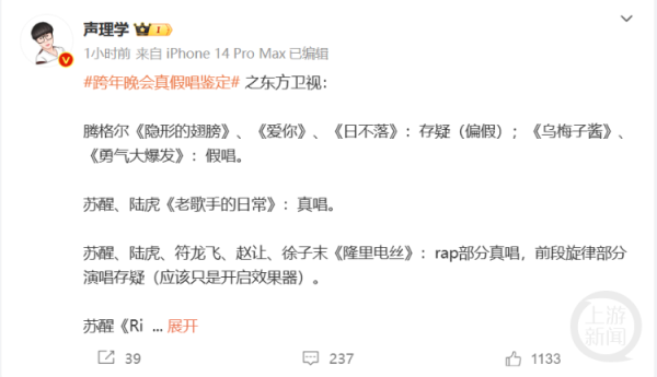 1月3日,曾举报五月天假唱的音乐博主“声理学”发布了我方对跨年晚会真假唱的个东说念主纵情,称腾格尔演唱的《隐形的翅膀》《爱你》《日不落》存疑(偏假);《乌梅子酱》《勇气大爆发》假唱。腾格尔和白举纲齐唱的《孤勇者》不异存疑。 除了腾格尔除外,“声理学”还暗示,黄明昊的《一东说念主之众》是假唱,田曦薇、丞磊的《甜甜的》是假唱,王子浩的《A·I.BAE》是假唱,BOYHOOD的《园地登陆》是假唱,胡歌、......【更多...】