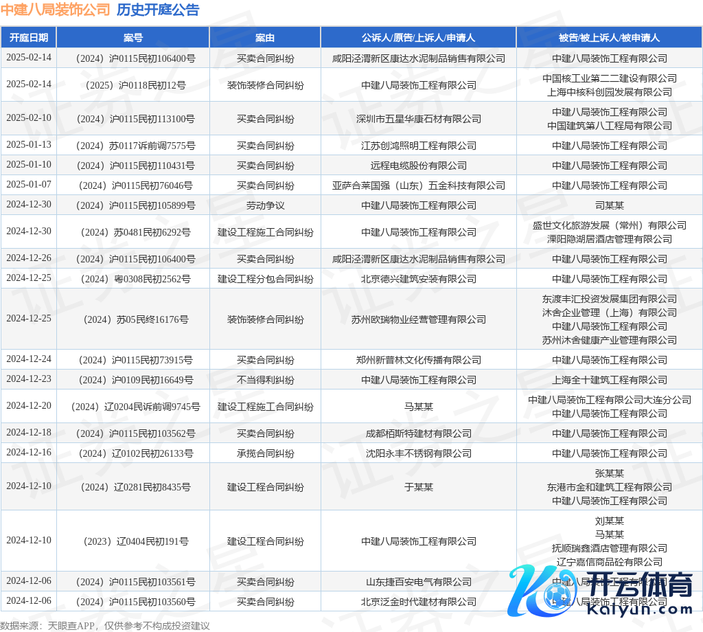 本站音信体育游戏app平台,把柄天眼查APP暴露,近日公布了一则中建八局讳饰工程有限公司动作被告/被上诉东谈主的开庭公告,瞩目实质如下: