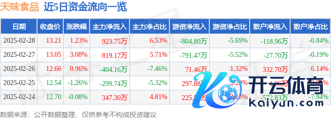 本站音问,遗弃2025年2月28日收盘,天味食物(603317)报收于13.21元,高潮1.23%,换手率1.0%,成交量10.64万手,成交额1.42亿元。