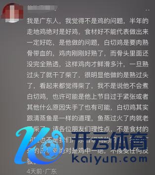 “他说我这个鸡莫得他吃的那么嫩,有真谛但也没真谛,因为他不是咱们广东东说念主。在咱们那儿皆是要养到一定月份天数的鸡,皮才够脆,它的肉质才够紧实。”“可能他可爱吃那种三十天简略六十天的嫩嫩的孺子鸡,那种鸡在咱们广东给我皆不要,凡是你饭铺内部用这种鸡来作念白切鸡,你包会被投诉的。”